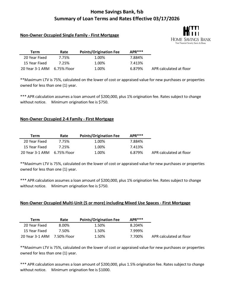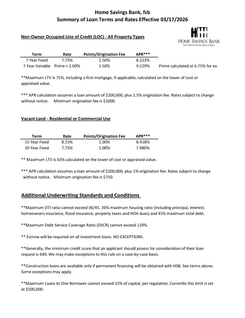 Adjustable rate loans, investment loans, land loans and construction loans available, call for quotes.
